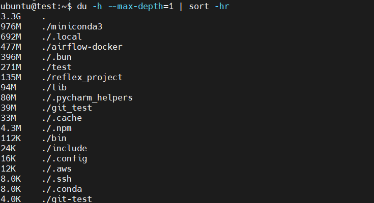 이때, sort -hr 명령어를 같이 사용하면 크기가 큰 순서대로 정렬이 가능하다.