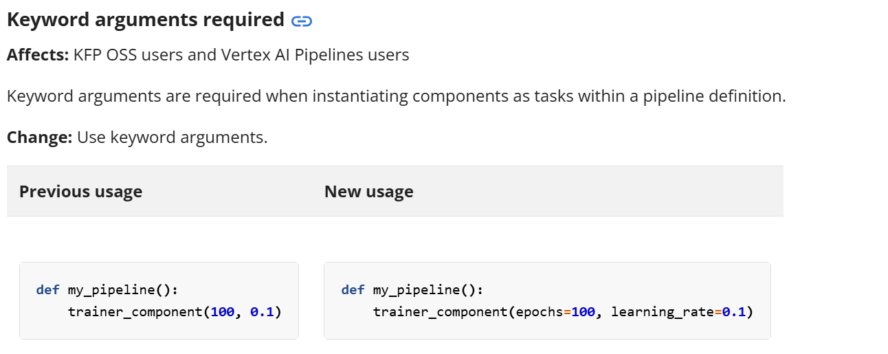 Kubeflow Pipelines V2에서는 컴포넌트을 인스턴스화 할때는 키워드 인자(Keyword arguments)를 사용해야합니다.